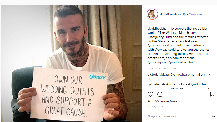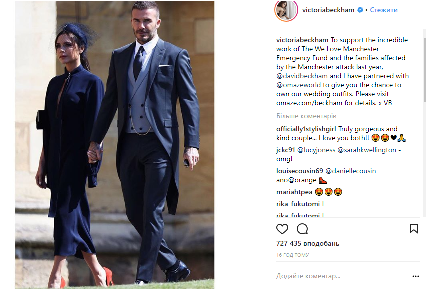 "Чтобы поддержать невероятную работу фонда The We Love Manchester Emergency Fund и семей, которые стали жертвами нападения в Манчестере в прошлом году, Виктория Бекхэм (Дэвид Бекхем) и я решили сотрудничать с Оmazeworld, чтобы дать вам возможность стать владельцами наших нарядов с королевской свадьбы", - написали Бекхэмы в своем Instagram.