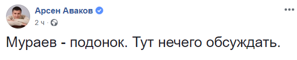 "Если Верховная Рада хотя бы на грамм себя уважает, то скотина Мураев будет лишен депутатского мандата. В мирной цивилизованной стране этот подонок попал бы в тюрьму как пособник террористов, а если бы была объявлена настоящая война, то Мураева бы пристрелили как предателя на месте. Интересно, как отреагирует парламент на это демонстративное и спланированное оскорбление умирающего за свои принципы человека и гражданина Украины агентом российских спецслужб Мураевым, который работает под прикрытием депутата и владельца телеканала NewsОne?".