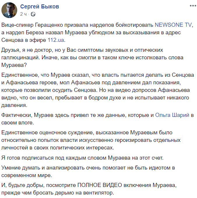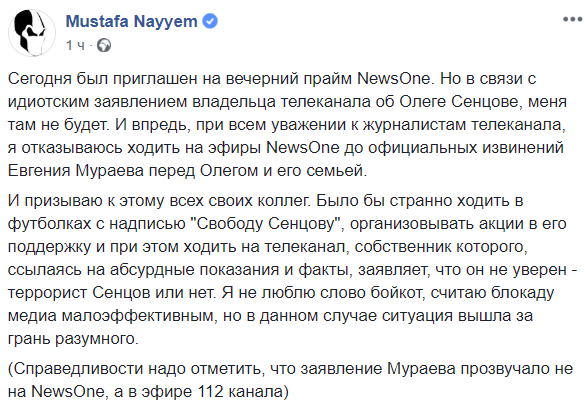 "Сегодня был приглашен на вечерний прайм NewsOne. Но в связи с идиотским заявлением владельца телеканала об Олеге Сенцове меня там не будет. И впредь, при всем уважении к журналистам телеканала, я отказываюсь ходить на эфиры NewsOne до официальных извинений Евгения Мураева перед Олегом и его семьей.