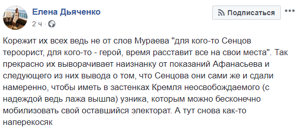 Блогер Елена Дьяченко считает, что Мураев напомнил власти, что ей выгодно заключение Сенцова – как это было и с Савченко, когда она была в российской тюрьме.