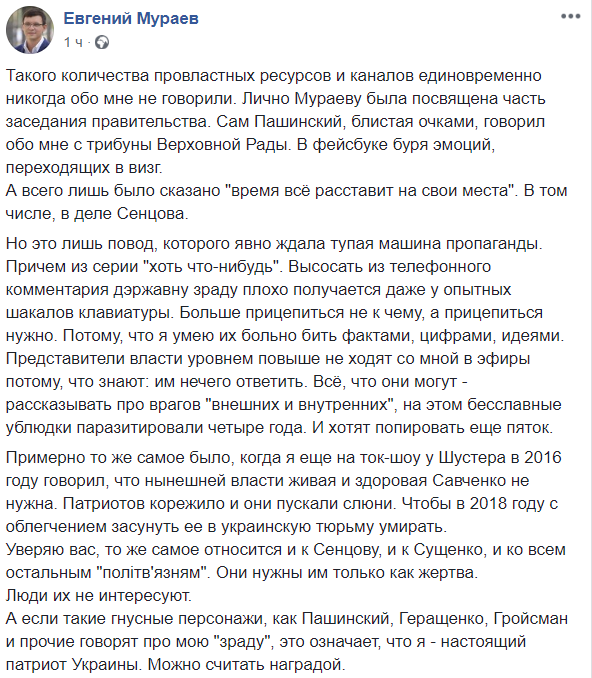 "Такое количество провластных ресурсов и каналов единовременно никогда обо мне не говорили. Лично Мураеву была посвящена часть заседания правительства. Сам Пашинский, блистая очками, говорил обо мне с трибуны Верховной Рады. В фейсбуке буря эмоций, переходящих в визг.