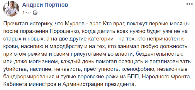 "Прочитал истерику, что Мураев – враг. Кто враг, покажут первые месяцы после поражения Порошенко, когда делить всех нужно будет уже не на старых и новых, а на две другие категории – на тех, кто непричастен к крови, насилию и мародерству, и на тех, кто занимал любую должность при этом режиме и своим присутствием во власти, бездеятельностью или даже молчанием каждый день помогал освящать и легализовывать убийства, насилие, ненависть, преступность, ксенофобию, незаконные бандформирования".