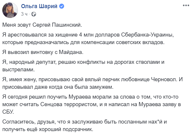 Журналистка Ольга Шарий напоминает, что инициатор уголовного дела против Мураева Сергей Пашинский сам имеет крайне сомнительную репутацию.