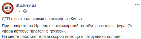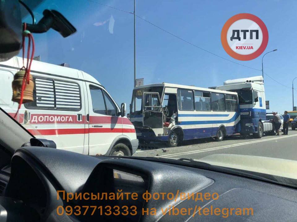 "При повороте на Ирпень в пассажирский автобус врезалась фура. От удара автобус "влетел" в грузовик”, - сказано в сообщении.