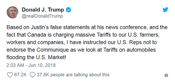 "Учитывая лживые заявления Джастина Трюдо во время пресс-конференции и тот факт, что Канада облагает наших американских фермеров, рабочих и компании огромными пошлинами, я приказал представителям США не подписывать коммюнике, пока мы рассматриваем возможность введения тарифов на автомобили, которые заваливают рынок США", - написал Трамп уже находясь в самолете по пути на встречу с Ким Чен Ыном.