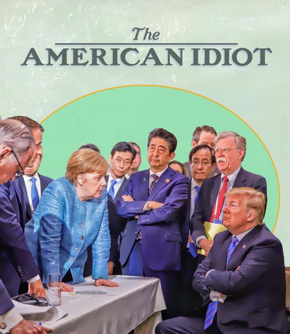 На фотографии, помимо глав ФРГ и США, присутствуют другие официальные лица, в частности, советник Трампа Джон Болтон и премьер-министр Японии Синдзо Абэ.