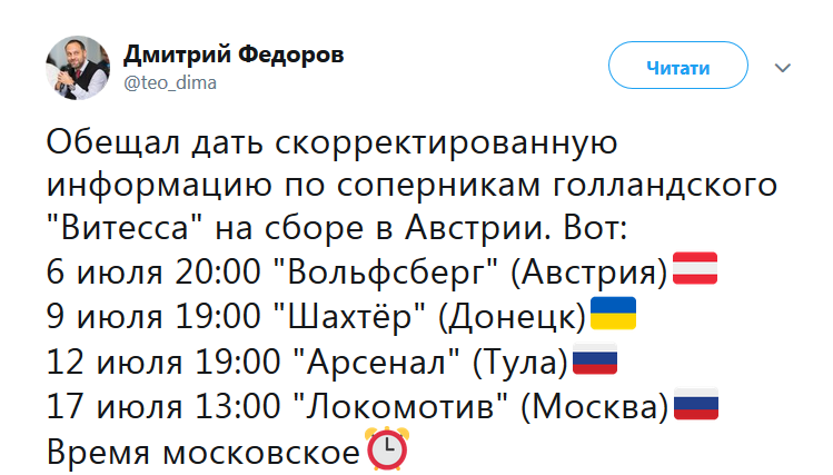 Кроме этого, первую тренировку под руководством Леонида Слуцкого голландцы проведут 24 июня. 6 июля Витесс сыграет с австрийским Вольфсбургом, 9 июля - с донецким Шахтером, 12 июля - тульским Арсеналом, 17 июля - московским Локомотивом.