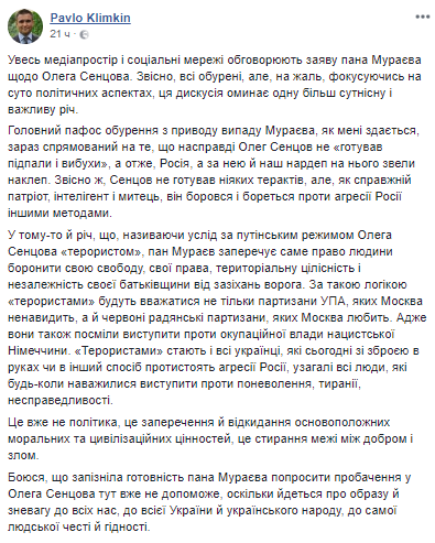 Министр иностранных дел Павел Климкин считает, что всех украинцев, которые противостоят агрессии России, можно считать "террористами" по логике нардепа Евгения Мураева. Об этом он написал в Facebook, комментируя скандальное высказывание Мураева о политзаключенном Олеге Сенцове.