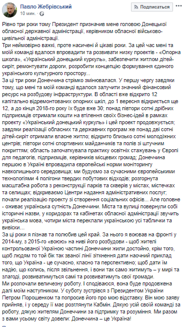 "В субботу, 9 июня, встретился с Президентом Украины Петром Порошенко и попросил его о моей отставке. Он мое заявление принял, и в среду ее должен рассмотреть Кабмин. Спасибо всей своей команде за работу, спасибо жителям Донбасса за поддержку и понимание. Мы вместе с вами всему миру доказали: Донбасс - это Украина!" - написал в соцсети Жебривский.