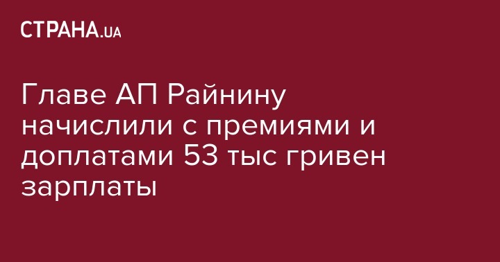 Заработная плата главы Администрации Президента Игоря Райнина за март составила 53 167 гривен. А в апреле Райнин заработал 11,9 тыс. гривен надбавки за интенсивность труда.