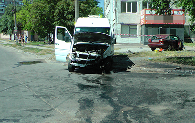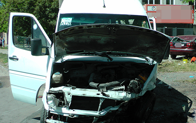 "10 июня около 13:20 водитель автомобиля Volvo, двигаясь по улице Карпенко-Карого, нарушил правила дорожного движения, а именно не соблюдал правил проезда перекрестков, и совершил столкновение с микроавтобусом Mersedes, который осуществлял пассажирские перевозки. В результате столкновения микроавтобус опрокинулся на бок", - сообщают в полиции.