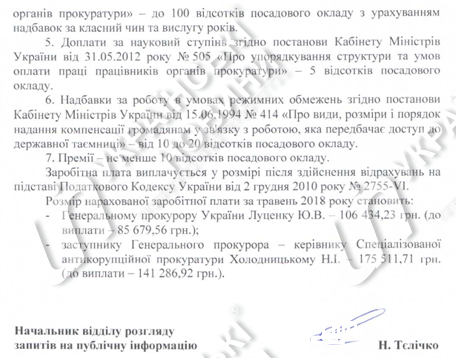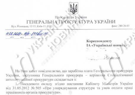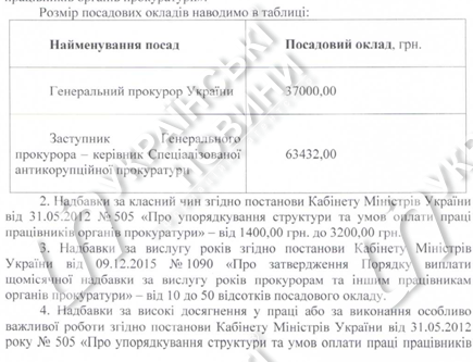 Должностной оклад генпрокурора составила 37 тыс. гривен. Также в зарплате указана с учетом надбавок, доплат, премии.
