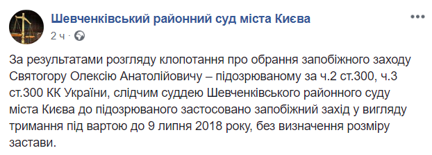 "По результатам рассмотрения ходатайства об избрании меры пресечения Святогору Алексею Анатолиевичу - подозреваемому по ч.2 ст. 300, ч.3 ст. 300 УК Украины, следственным судьей Шевченковского районного суда города Киева к подозреваемому применена мера пресечения в виде содержания под стражей до 9 июля 2018 года, без определения размера залога", - говорится в сообщении Шевченковского райсуда на странице в Facebook.
