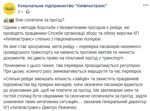 "Совместные рейды уменьшат количество "зайцев" и защитят работников предприятия от досадных случаев, когда указанные пассажиры прибегают к агрессивным действиям, чтобы не платить за проезд. Мы призываем киевлян и гостей столицы осознавать и своевременно оплачивать проезд, чтобы избежать таких негативных ситуаций", - отметил генеральный директор "Киевпастранса" Дмитрий Левченко.