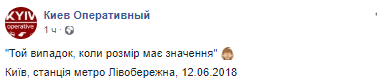 "Тот случай, когда размер имеет значение. Киев. Станция метро "Левобережная. 18.08.2018", - говорится в сообщении.