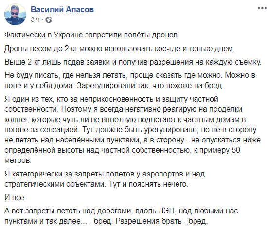 "Я категорически за запреты полетов у аэропортов и над стратегическими объектами. ... А вот запреты летать над дорогами, вдоль ЛЭП, над любыми нас пунктами и так далее - бред. Разрешения брать - бред", - считает Апасов.