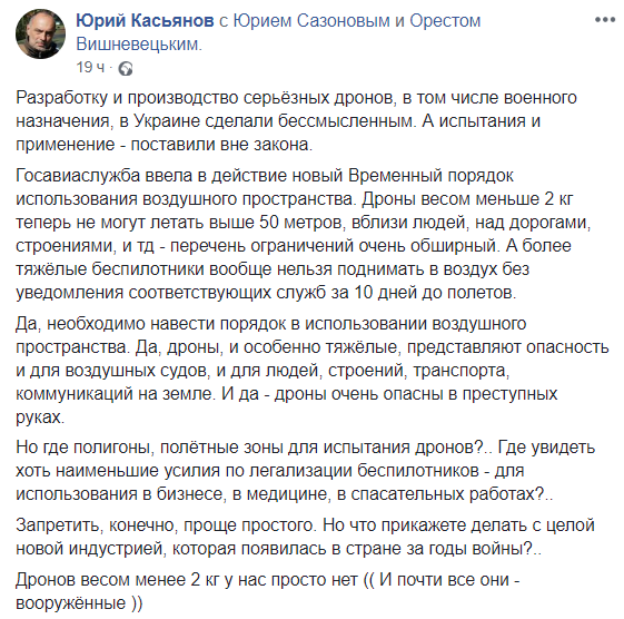 Волонтер Юрий Касьянов заявил, что новые правила ставят крест на разработке украинских беспилотников - их попросту невозможно будет нормально испытывать.