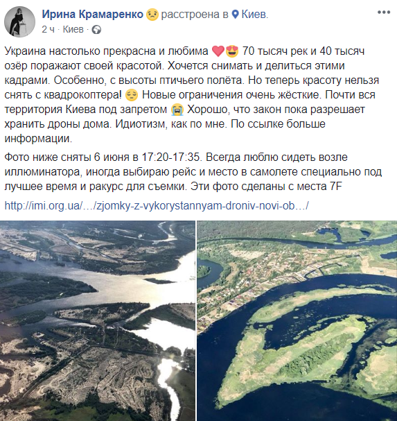 "Украина настолько прекрасна и любима! 70 тысяч рек и 40 тысяч озёр поражают своей красотой. Хочется снимать и делиться этими кадрами. Особенно, с высоты птичьего полёта. Но теперь красоту нельзя снять с квадрокоптера! Новые ограничения очень жёсткие. Почти вся территория Киева под запретом. Хорошо, что закон пока разрешает хранить дроны дома. Идиотизм, как по мне".