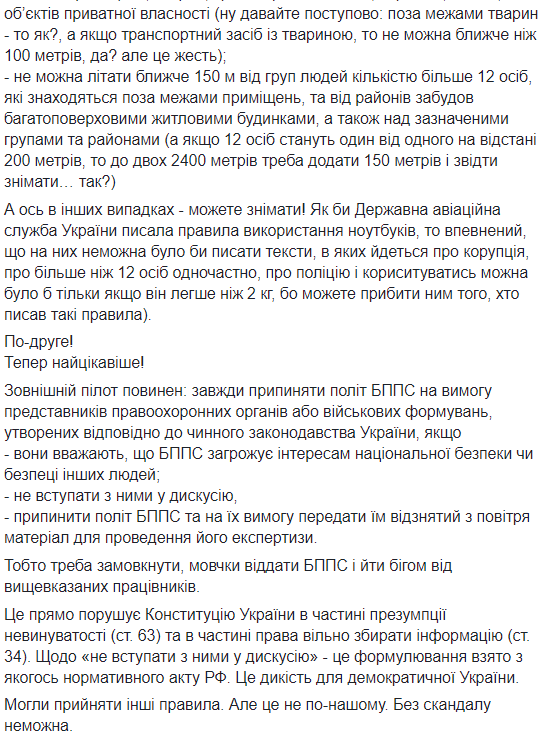 Он также сделал детальный анализ правил, из которого следует еще и то, что при первом требовании правоохранителей владелец должен отдать беспилотник для экспертизы отснятого материала.