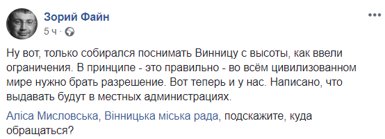 "Ну вот, только собирался поснимать Винницу с высоты, как ввели ограничения. В принципе - это правильно - во всём цивилизованном мире нужно брать разрешение. Вот теперь и у нас".