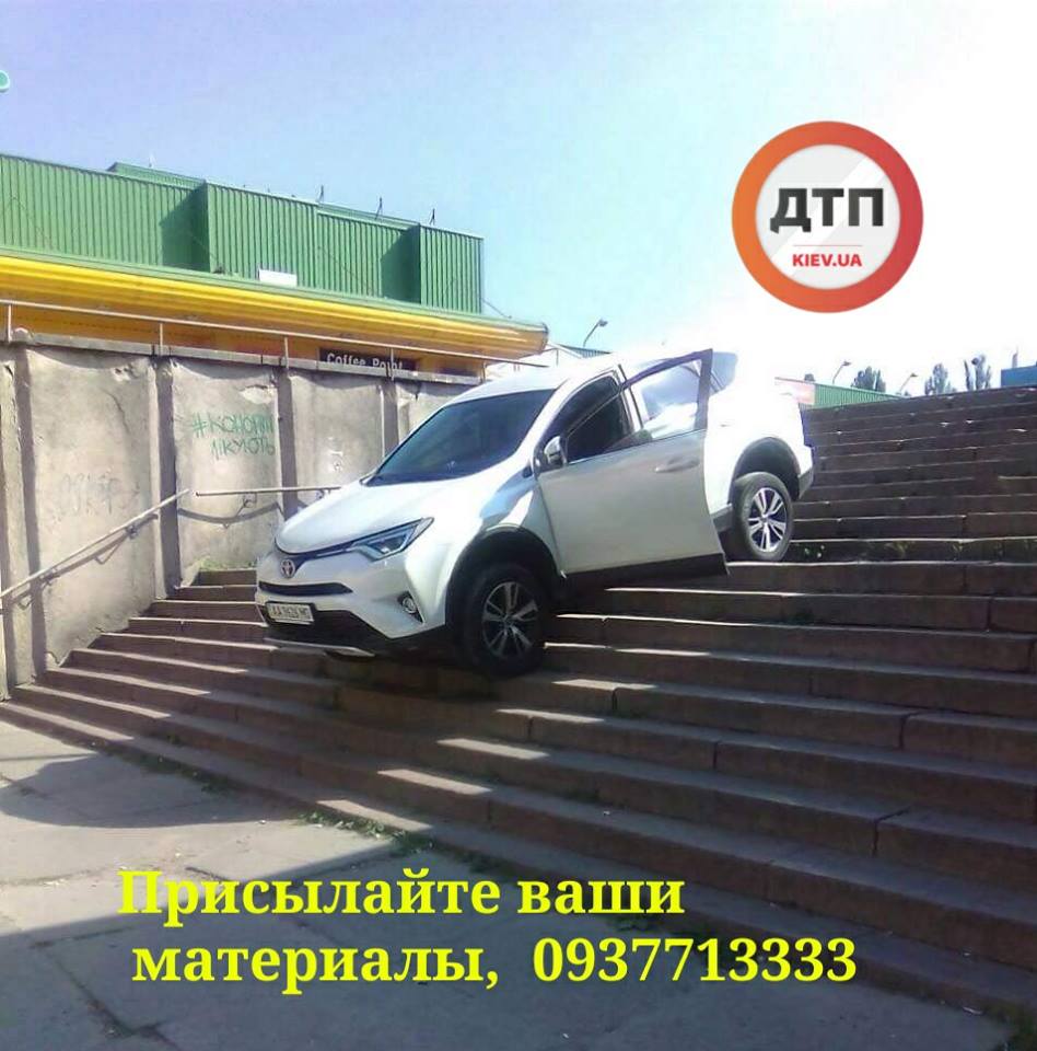 В Святошинском районе Киева на проспекте Леся Курбаса, 6г, на ступеньках лестницы застрял автомобиль Toyota. Об этом сообщается на странице ресурса dtp.kiev.ua в Facebook.