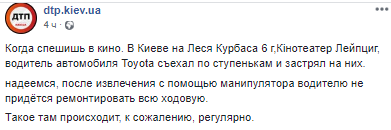 "Когда спешишь в кино. В Киеве на Леся Курбаса 6 г, Кинотеатер Лейпциг, водитель автомобиля Toyota съехал по ступенькам и застрял на них.
