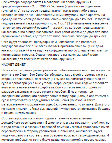 "Более того, мы уже подавали такой иск, но в ходе лечения и оказания правовой помощи исковые требования были пересмотрены в сторону увеличения. Новый иск, конечно же, будет подан открыто и в соответствии со всеми нормами законодательства. И исковые требования точно будут выше упоминаемой в прессе суммы (то есть больше 100 000 долларов - Прим.Ред.)", - сообщил пострадавший нардеп.