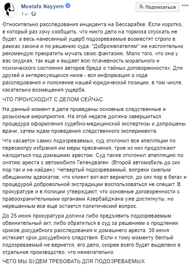 Ни в какие закрытые договоренности с обвиняемыми никто не вступал и вступать не будет. Это было бы абсурдно, как с моей стороны, так и со стороны обвиняемых, поскольку (1) им это не поможет уклониться от суда и приговора (2) а мне уголовно-процессуальный кодекс позволяет возместить нанесенный ущерб в любом согласованном сторонами размере законным и прозрачным способом. В частности, при совершении уголовного преступления я могу официально обратиться в суд и потребовать у подсудимых возмещения убытков, а также материального и морального ущерба, понесенных по их вине", - написал в соцсети Найем и добавил, что соответсвующий иск он может подать в течение всего времени досудебного расследования.
