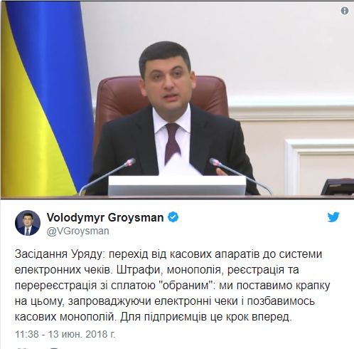 Гройсман анонсировал переход от кассовых аппаратов к системе электронных чеков Фото: Volodymyr Groysman/Twitter