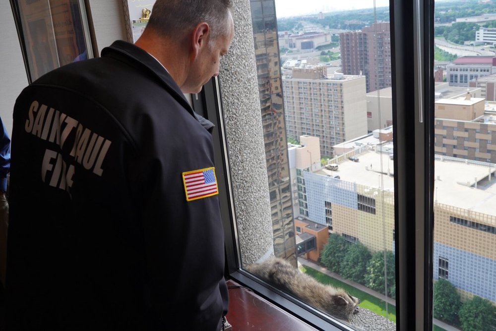 Енот забрался на крышу небоскреба в Миннесоте и стал звездой соцсетей. Видео