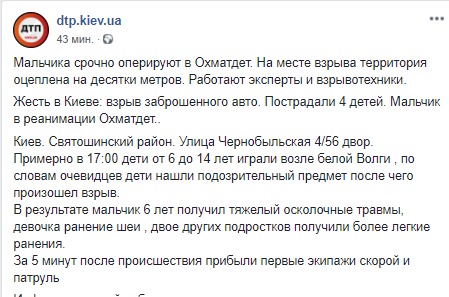 В интернет-сообществе dtp.kiev.ua в Facebook появились данные о состоянии детей, пострадавших в результате взрыва на улице Чернобыльской в Святошинском районе Киева.