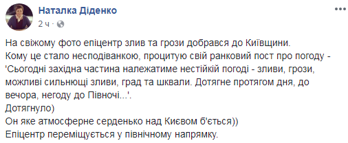 "На свежем фото эпицентр ливней и грозы добрался до Киевщины. Кому это стало неожиданностью, процитирую свой утренний пост о погоде - Сегодня западная часть будет принадлежать неустойчивой погоде - ливни, грозы, возможны сильные ливни, град и шквалы. Дотянет в течение дня, к вечеру, непогоду к Северу ... Дотянуло", – написала она.