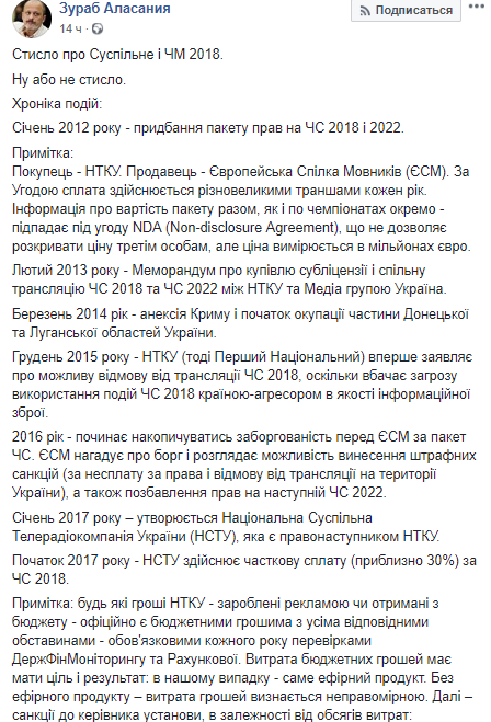 Он отметил, что Европейский союз вещателей (ЕСВ) угрожал Украине лишением прав на показ следующего чемпионата, а также штрафом. Национальная телерадиокомпания Украины за 8 миллионов гривен приобрела права на трансляцию чемпионата мира по футболу еще в 2010 году. Однако из-за политического давления по мере эскалации конфликта между Украиной и Россией в феврале 2018 года Аласания заявил, что транслировать ЧМ-2018 компания не будет.