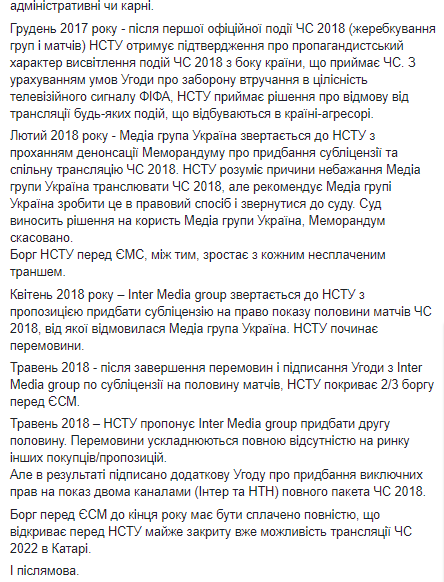"Дополнительное соглашение о приобретении исключительных прав на показ полного пакета чемпионата мира по футболу в РФ украинскими телеканалами "Интер" и НТН позволяет надеяться на показ НОТУ чемпионата мира в Катаре, который состоится в 2022 году", - написал Аласания.