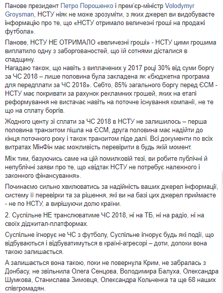 Против трансляции высказались глава МИД Павел Климкин, а также ряд нардепов от разных фракций. Телеканалы один за одним стали отказываться от показа ЧМ-2018. Тем не менее 30 мая Inter Media Group (владеет телеканалом "Интер") приобрела у Национальной общественной телерадиокомпании Украины эксклюзивные права на трансляцию матчей Чемпионата мира по футболу-2018.