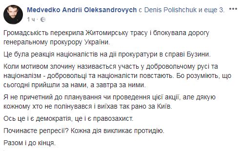 "Это была реакция националистов на действия прокуратуры в деле Бузины. Когда мотивом преступления называется участие в добровольческом движении и национализм - добровольцы и националисты восстают. Потому что понимают, что сегодня пришли за нами, а завтра за ними", - заявил в Facebook Андрей Медведько, один из обвиняемых в убийстве Бузины.