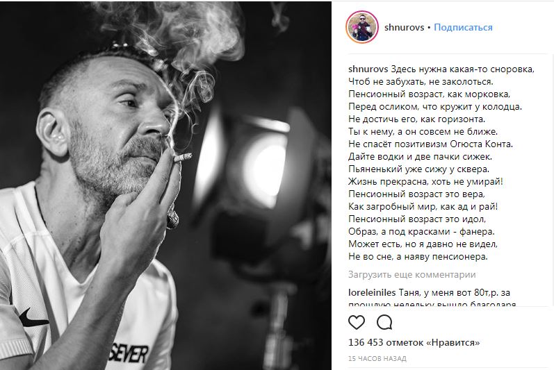 Лидер российской группы "Ленинград" Сергей Шнуров опубликовал стихотворение, посвященное повышению пенсионного возраста в России.