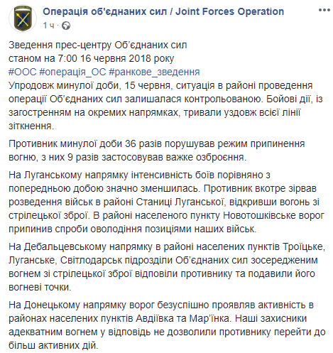 За минувшие сутки на Донбассе сепаратисты 36 раз проводили обстрел украинских позиций ВСУ. Об этом сообщает штаб ООС в Facebook.