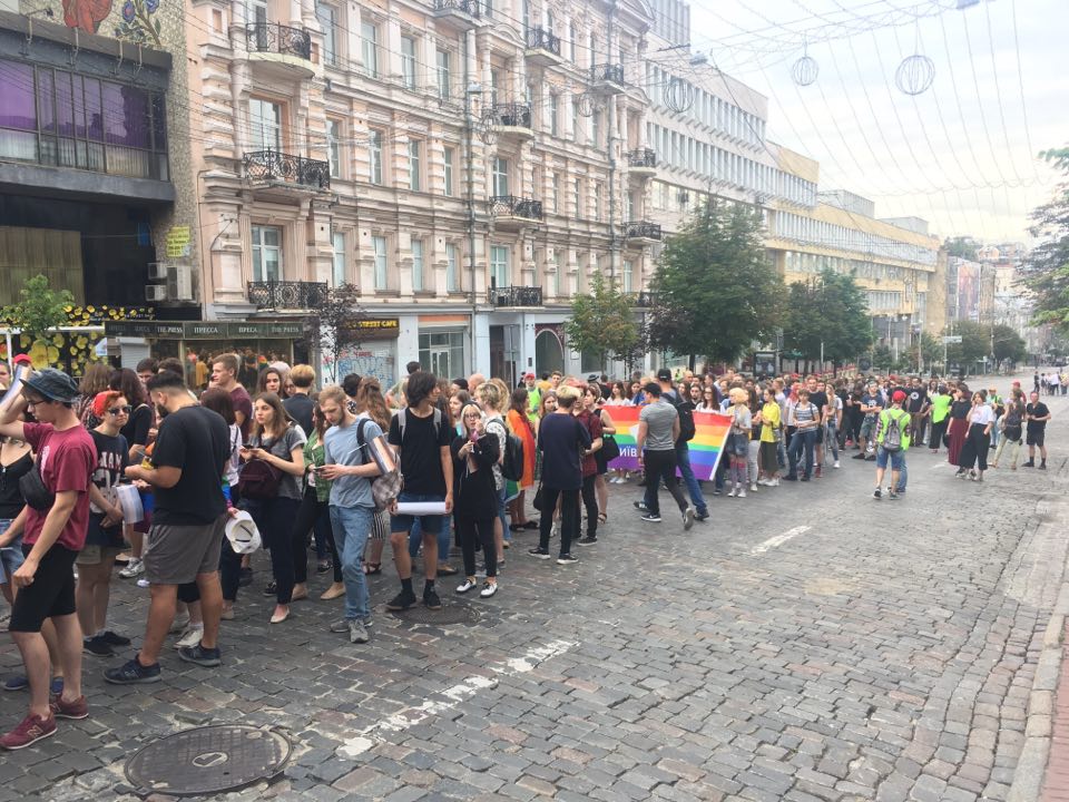 Примерно в 6 часов группа лиц, а это более 150 человек, вышли на перекресток улицы Владимирская - бульвар Тараса Шевченко и перекрыли дорогу на маршруте движения "Марша равенства".