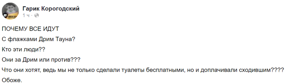 11:43  Почему все идут с флажками Дрим-Тауна? Кто эти люди? Они за Дрим или против?", - пишет владелец ТРЦ Гарик Корогодский, намекая, что флаги ЛБГТ похожи на эмблему торгового центра.
