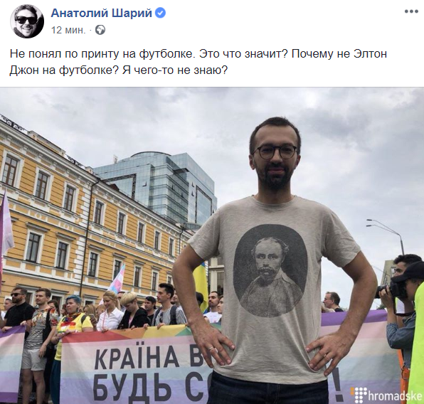 11:15  В соцсетях удивляются футболе нардепа Сергея Лещенко, на которой изображен Тарас Шевченко. Отметим, что Лещенко пришел поддержать прайд.