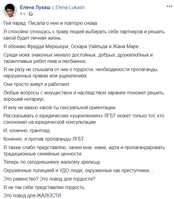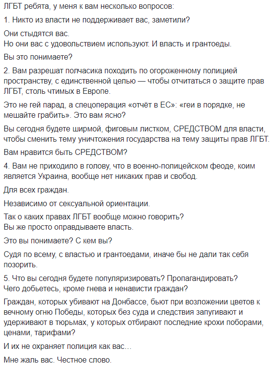 "Люди, которые еще недавно до глубины души возмущались тем, что наци устраивают сафари на инакомыслящих, что радикалы нападают на тех, кто вышел защитить свои убеждения, например, в виде сохраненного памятника Ватутину, сегодня веселятся от того, что очередные нацики объявили сафари на участников лгбт-марша. И откровенно ратуют за физическое устранение.