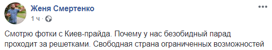 12:43  "Смотрю фотки с Киев-прайда. Почему у нас безобидный парад проходит за решетками. Свободная страна ограниченных возможностей", - отмечает журналист Евгений Смертенко.