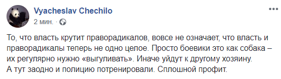12:08  "То, что власть крутит праворадикалов, вовсе не означает, что власть и праворадикалы теперь не одно целое. Просто боевики это как собака – их регулярно нужно "выгуливать". Иначе уйдут к другому хозяину. А тут заодно и полицию потренировали. Сплошной профит", - объясняет столкновение между полицией и С14 журналист Вячеслав Чечило.