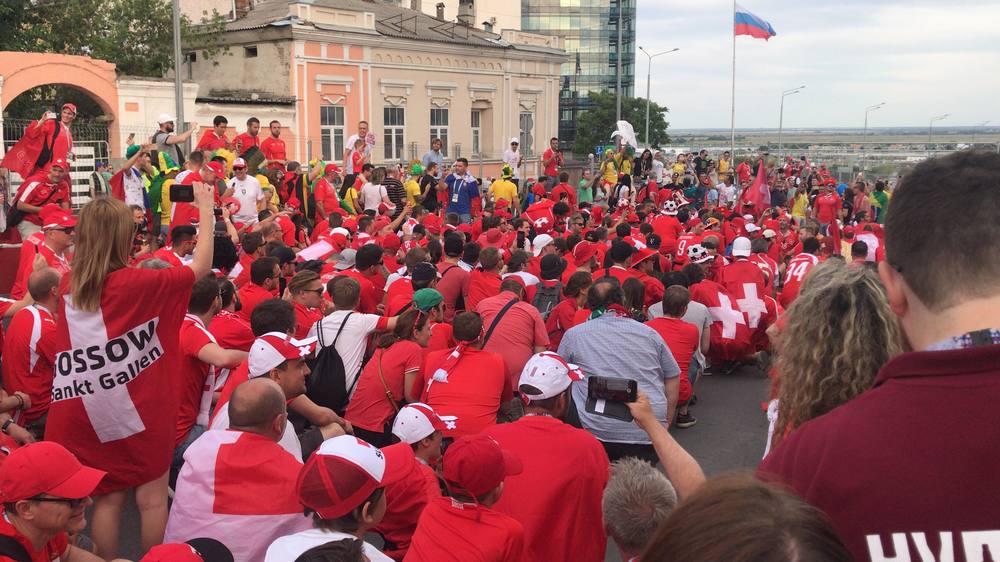 20.25 Полчаса до матча, ведущие развлекают фанатов и учат петь бразильскую песню на караоке, а болельщики сборной Швейцарии, которые движутся к стадиону, разминают глотки.
