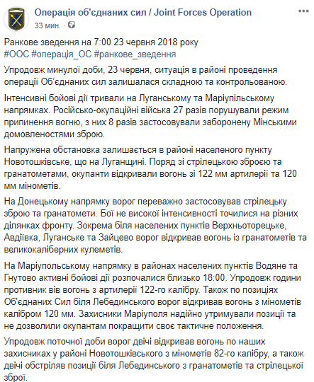 За прошедшие сутки на Донбассе зафиксировано 27 обстрелов. Об этом сообщает пресс-центр штаба ООС в Facebook.
