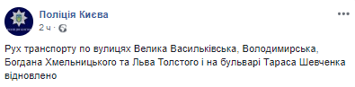 В Киеве, где в воскресенье прошел 20-минутный "Марша равенства", движение транспорта по улицам Большая Васильковская, Владимирская, Богдана Хмельницкого и Льва Толстого и на бульваре Тараса Шевченко было возобновлено после перекрытия.