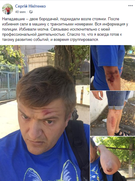 "Нападавшие - двое бородачей, поджидали возле стоянки. После избиения сели в машину с транзитными номерами. Вся информация у полиции. Избивали молча. Связываю исключительно с моей профессиональной деятельностью. Спасло то, что я всегда готов к такому развитию событий, и вовремя сгруппировался", - описал инцидент журналист и добавил фотографии.