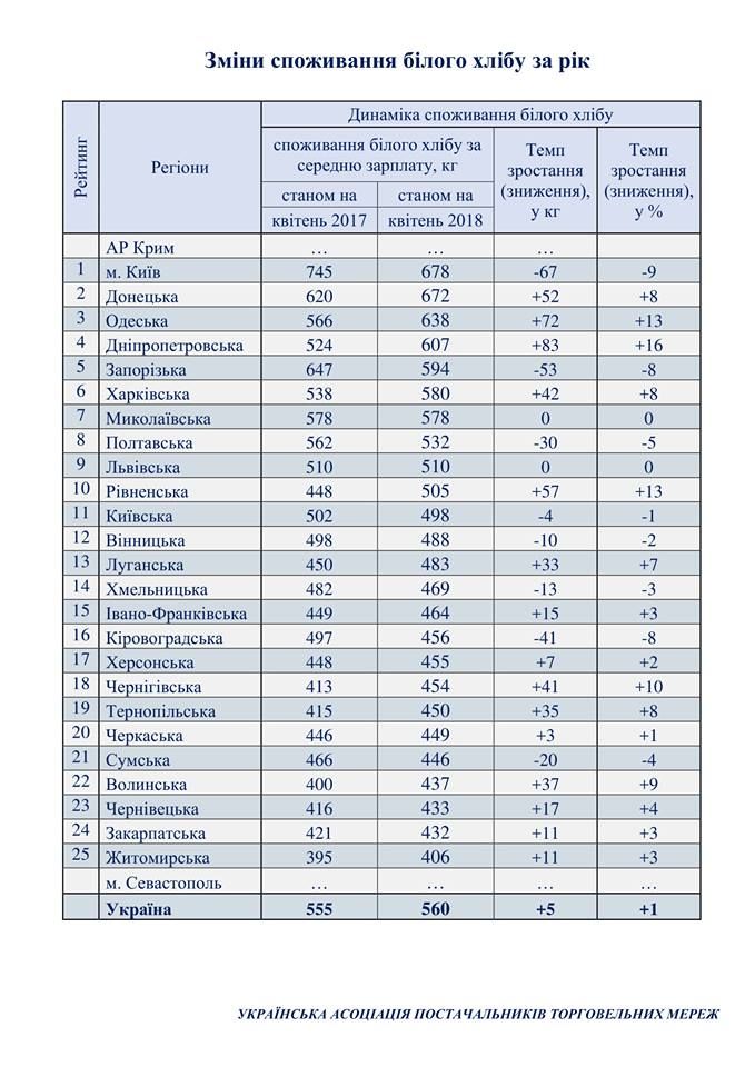"В среднем украинец может себе позволить на конец апреля этого года 560 кг белого хлеба, в то время как в прошлом - 555 кг", - пишет Дорошенко.