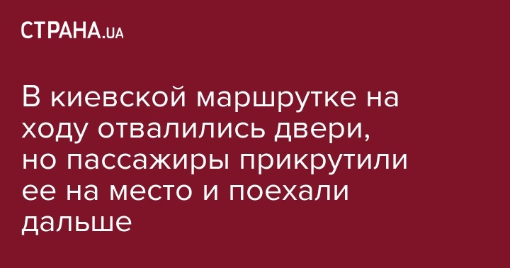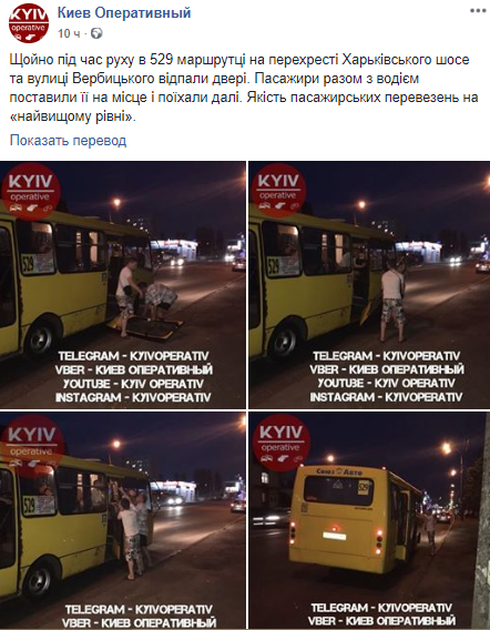 "Во время движения в 529 маршрутке на перекрестке Харьковского шоссе и улицы Вербицкого отвалились двери. Пассажиры вместе с водителем поставили ее на место и поехали дальше. Качество пассажирских перевозок на "высоком уровне", - говорится в сообщении.